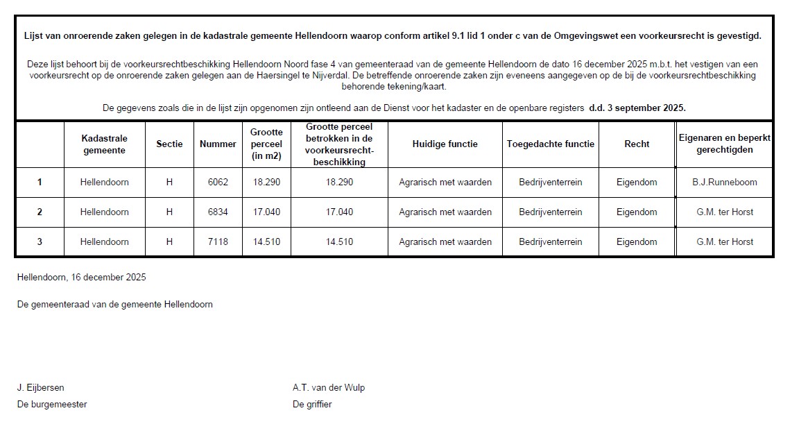 De gemeenteraad van de gemeente Hellendoorn maakt op grond van artikel 16.32b Omgevingswet bekend dat hij op 16 december 2025 een voorkeursrechtbeschikking heeft genomen op basis van artikel 9.1, eerste lid, sub c van de Omgevingswet. Hiermee is op diverse onroerende zaken, gelegen aan de Haersingel te Nijverdal, een gemeentelijk voorkeursrecht gevestigd.
