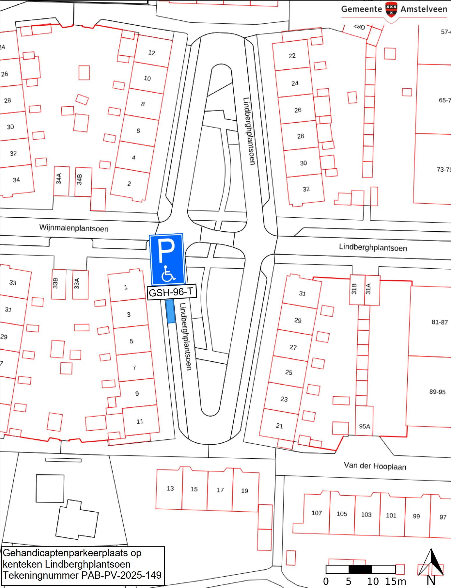 Burgemeester en wethouders van Amstelveen besluiten het parkeren te verbieden op een parkeerplaats in de straat Lindberghplantsoen, zoals aangegeven op tekening PAB-PV-2025-149, met uitzondering van het voertuig met het kenteken GSH-96-T (gehandicaptenparkeerplaats).