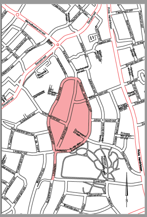 Als aangewezen gebied, bedoeld in artikel 2 van de Verordening reclamebelasting Brunssum 2026, geldt het op onderstaande kaart rood gekleurde gedeelte.