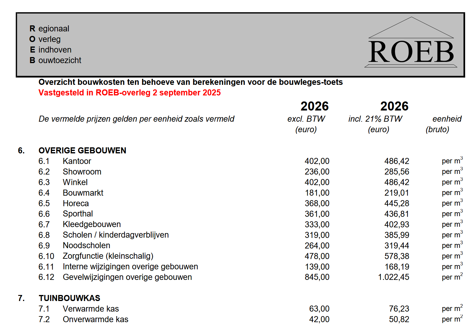 Bijlage 1: ROEB-lijst 2026 voor het bepalen van bouwkosten