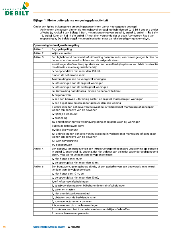 Het in titel 2, hoofdstuk 1, paragraaf 1 van de Tarieventabel 2024 behorende bij deze verordening genoemde normblad NEN 2699, uitgave 2013, of zoals dit normblad laatstelijk is vervangen of gewijzigd, en de Uniforme Administratieve Voorwaarden voor de uitvoering van werken 2012 (UAV 2012) de voorwaarden die bekendgemaakt zijn in Staatscourant 2012, 1567, http://wetten.overheid.nl/BWBR0031190/2012-03-01, worden bekendgemaakt door terinzagelegging in het gemeentehuis, Soestdijkseweg Zuid 173 te Bilthoven alsmede ten kantore van de BghU, Stadsplateau 1 te Utrecht.