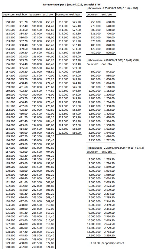 Tarieventabel 2026, behorende bij de 'Legesverordening 2026'