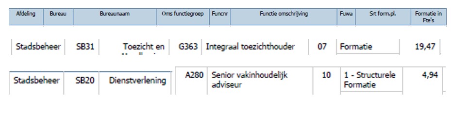 Er is 19,5 fte aan formatie voor de Integraal toezichthouder (zie onderstaand overzicht uit het formatiesysteem). We rekenen 50% van deze formatie toe aan de naheffingsaanslag omdat de integraal toezichthouders ongeveer 50% van hun tijd aan taken voor fiscaal parkeren verrichten. Dat betekent: 9,75 fte tegen een loonsom van € 70.977, schaal 7 betekent een toerekening aan personeelskosten van € 692.026.