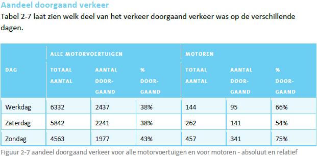 uit de verkeersmetingen ook blijkt dat er in de weekenden een aanmerkelijke toename is van het gemeten aantal motorfietsen en dat er vastgesteld is dat het aandeel doorgaand verkeer in het weekend ook groter is;
