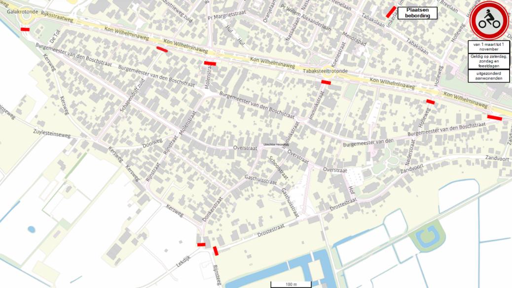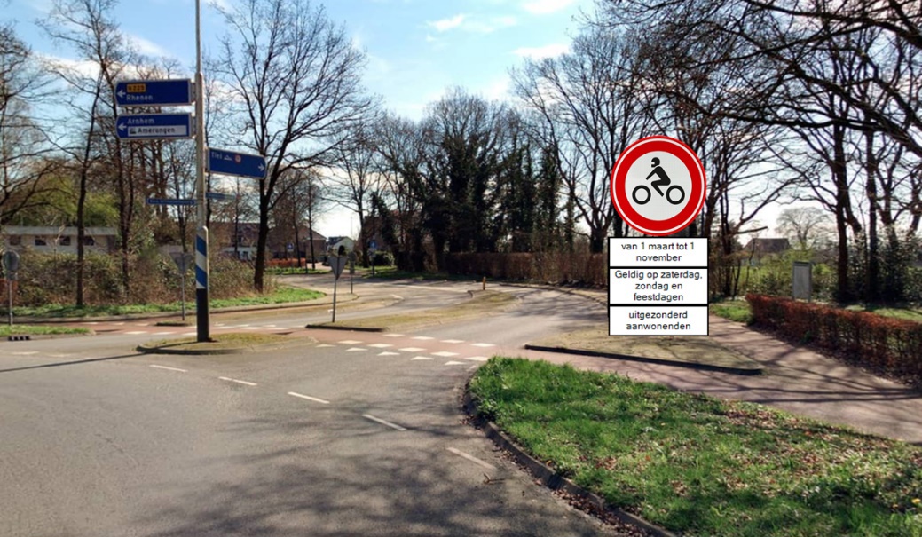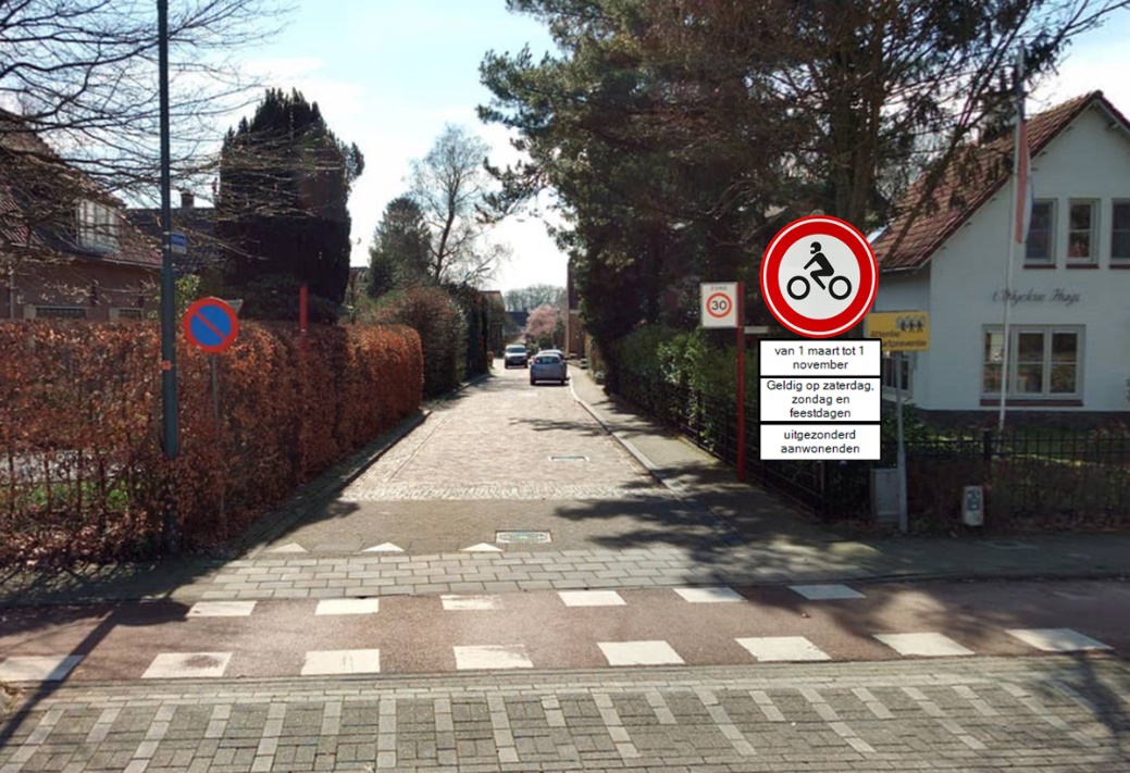 het instellen van een inrijverbod voor motorfietsen door middel van het plaatsen van verkeersbord C11 (Gesloten voor motorfietsen) uit bijlage I van het Reglement Verkeersregels en Verkeerstekens 1990 (RVV 1990) op de Utrechtsestraatweg, Donkerstraat, Drostestraat, Burgemeester van den Boschstraat, Holleweg, Imminkstraat, Schapendrift-Zuid en Molenstraat, zoals weergegeven op bijgevoegde situatieschets;