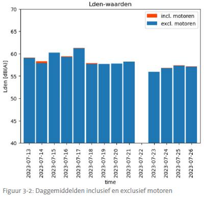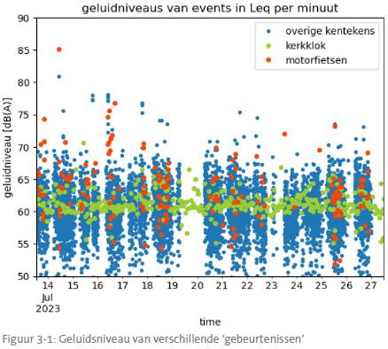 binnen deze geluidsmeting onderscheid is gemaakt tussen motorfietsen en andere motorvoertuigen, tevens is het luiden van de kerkklokken van de nabij aanwezige kerk meegenomen in de meting;