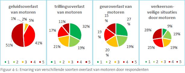 van deze 240 respondenten 55% heeft aangegeven een vorm van overlast te ervaren door motorfietsen. Dit kon zijn in de vorm van geluidsoverlast, trilling overlast, geuroverlast en onveilige verkeerssituaties. In onderstaande figuur (Figuur 4-1) is weergegeven op welke schaal de respondenten, die aangegeven hebben overlast te ervaren, deze verschillende vormen ervaren: