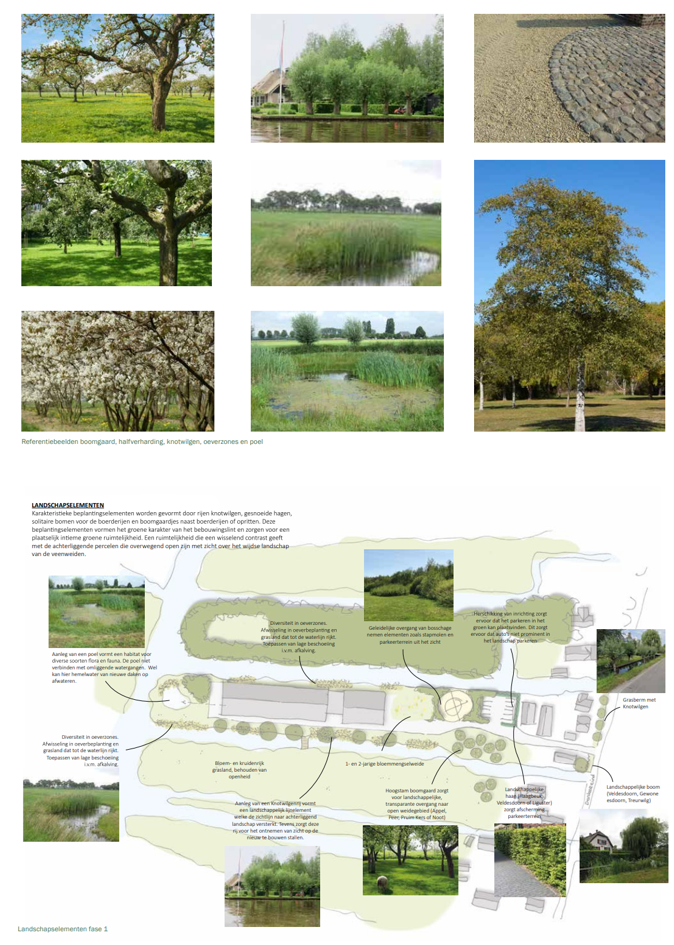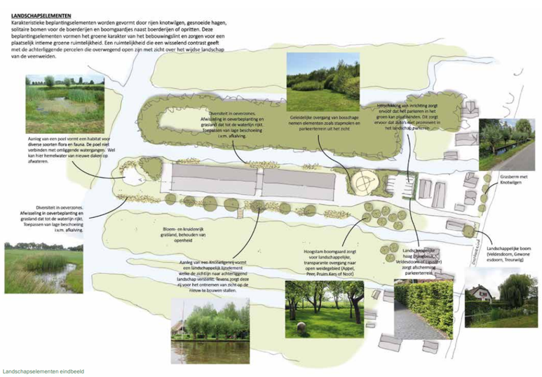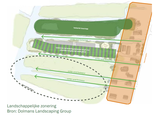 Van noord naar zuid is er sprake van een geleidelijke overgang van het aangrenzende bosperceel naar het open landschap. Die overgang vindt plaats door toepassing van bosschages aan de noordzijde, een hoogstamboomgaard ten zuiden daarvan en vervolgens via de open watergang een open weidelandschap met een enkele boomgroep.