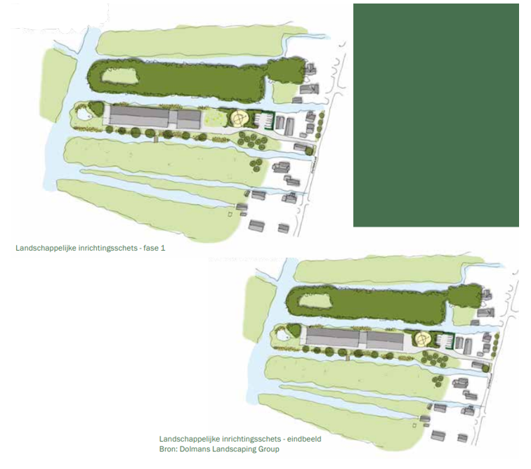 Het voorste gebouw, waarin de paardenboxen en diverse bijbehorende ruimten zijn voorzien, zal in de eerste fase kleiner zijn en later worden uitgebreid. In de eerste fase wordt een volume gerealiseerd met ruimte voor 6 paardenboxen. Pas na het verkrijgen van de benodigde natuurvergunning en als de grondgebondenheid is gewaarborgd, wordt dit volume uitgebreid naar 20 paardenboxen. De uitbreiding in de tweede fase betekent dat de 1- en 2-jarige bloemenweide verdwijnt.