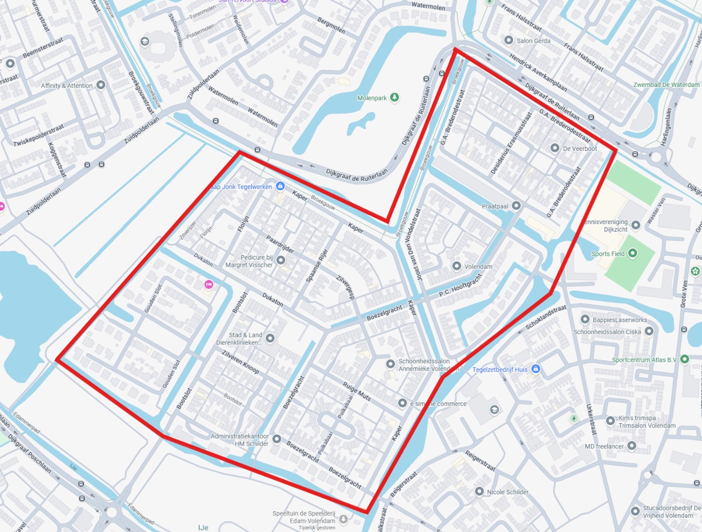 Het gebied waarbinnen artikel 2.1 lid 1 van de Algemene plaatselijke verordening Edam-Volendam wordt gehandhaafd, is gearceerd weergegeven op de bijgevoegde kaart in bijlage 1. Het samenscholingsverbod is van toepassing voor onder andere de straten: de Kaper, Boezelgracht, P.C. Hooftgracht, G.A. Brederodestraat, Bootslot, Zilveren Knoop, Zilvergesp, Paardrijder, Florijn, Dukaton, Spaanse Rijer, Gouden Slot, Zilverijzer, Joost van Den Vondelstraat in Volendam.