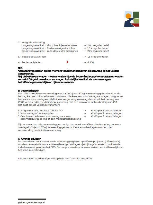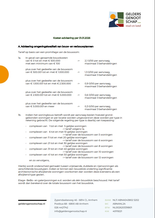 voor een advies van de gemeentelijke adviescommissie als bedoeld in deVerordening gemeentelijke adviescommissie omgevingskwaliteit dat uitsluitend betrekking heeft op redelijke eisen van welstand, als bedoeld in de gemeentelijke beleidsregels bedoeld in artikel 4.19 van de Omgevingswet: Tarieven blijken uit de bijgevoegde gewaarmerkte tarievenregeling van het Gelders Genootschap.