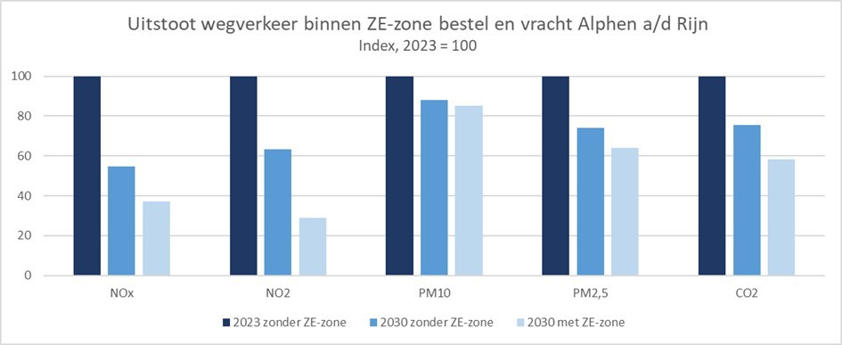 Figuur 1 Uitstoot wegverkeer binnen nul-emissie zone bestel- en vrachtverkeer Alphen aan den Rijn, geïndexeerd (Effectenonderzoek ZE-zone gemeente Alphen aan den Rijn, 2025, zie bijlage 5, p.6).