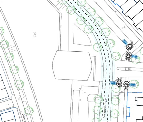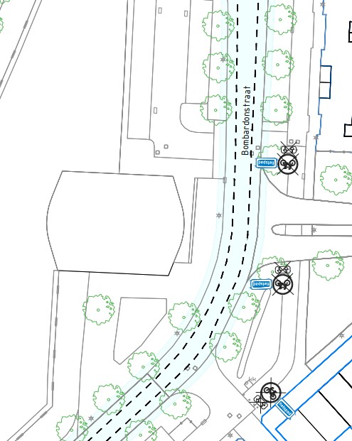 Rondom de Bombardonstraat liggen een aantal stukjes vrijliggend fietspad die middels verkeersbord G11 van bijlage 1 van het RVV 1990 aangewezen zijn als verplicht fietspad. Dit zijn veelal koppelstukken tussen de wegen die parallel liggen aan de Bombardonstraat waar nu de fietsroute overheen gaat. Vanwege de herkenbaarheid van de Bombardonstraat als GOW 30 is het de wens de fietsroute hier overheen te laten lopen en hier fietsstroken te realiseren.