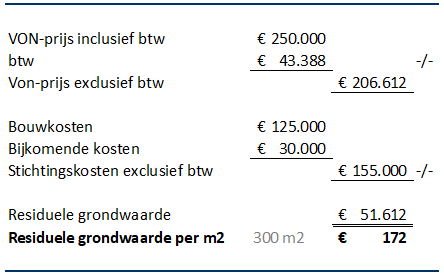 Om de grondprijzen te bepalen heeft de gemeente een marktonderzoek uitgevoerd. Op basis van marktontwikkelingen, een analyse van de verkoopprijzen van recent verkochte referentiewoningen en de bijbehorende stichtingskosten zijn voor de verschillende categorieën residuele grondwaardeberekeningen uitgevoerd. Zie onderstaand voor een (fictief) voorbeeld van de residuele waardeberekening op basis van een kavel van 300 m2.