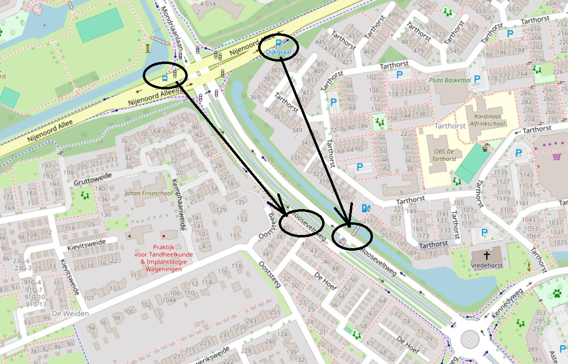 Daarom willen we deze bushalte verplaatsen. Voor de doorstroming van de bus doen we dat na de verkeerslichten. Maar net om de hoek op de Rooseveltweg is geen ruimte beschikbaar. Hier gaan we het fietspad namelijk verbreden. De eerste mogelijkheid daarna is waar dat fietspad de huidige breedte blijft. Dat is nabij de Ooststeeg en De Hoef. En ook in de buurt van de brug naar de Tarthorst. Veel dichter bij de brug is minder gewenst. De halte zou dan aan de voorzijde en zicht van een rij woningen komen.