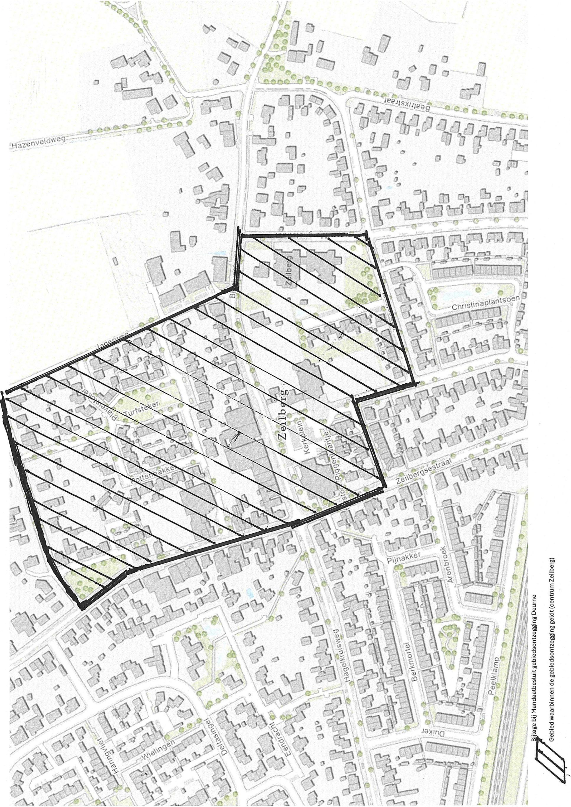 Alle openbare wegen, parken, parkeerplaatsen, pleinen en overige voor het publiek openstaande en toegankelijke plaatsen en gebouwen gelegen binnen het gebied omsloten door de Legerweg, Jagerweg, Blasiusstraat, Margrietstraat, Irenestraat, Mariastraat, Zeilbergsestaat, genoemde (delen van de) paden en straten inbegrepen zoals aangegeven op de bij dit besluit behorende kaart.