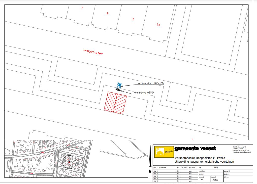met het plaatsen van verkeersbord E8c van bijlage 1 van het Reglement verkeersregels en verkeerstekens 1990 (parkeergelegenheid alleen bestemd voor het opladen van elektrische voertuigen), voorzien van het onderbord OB504 (geldt voor twee vakken) en het aanbrengen van belijning voor twee parkeervakken nabij het adres Bosgeelster 11 in Twello te reserveren als parkeergelegenheid bestemd voor het opladen van elektrische voertuigen.