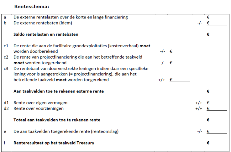 Voorschriften over hoe een gemeente met rente om moet gaan zijn vastgelegd in het Besluit Begroting en Verantwoording provincies en gemeenten (BBV). Ter duiding en praktische toepassing van die regelgeving heeft de Commissie BBV de Notitie rente 2023 gepubliceerd. In die notitie wordt de impact van rente op de gemeentelijke begroting toegelicht, zowel als inkomsten- en als kostenpost. Tevens gaat deze notitie in op de interne toerekening van rente aan investeringen. De BBV Notitie rente bevat aanbevelingen (die gevolgd mogen worden) en stellige uitspraken (die gevolgd moeten worden). Tot de aanbevelingen behoort om geen rentevergoeding over het eigen vermogen of voorzieningen te berekenen en om het renteschema te hanteren (zie Bijlage 2). Tot de stellige uitspraken behoren de verplichting om rentelasten en -baten op het taakveld Treasury te verzamelen en de beschrijving van de wijze waarop de omslagrente moet worden berekend en wat de tolerantiegrens is voor afwijkingen tussen begroting en werkelijkheid.