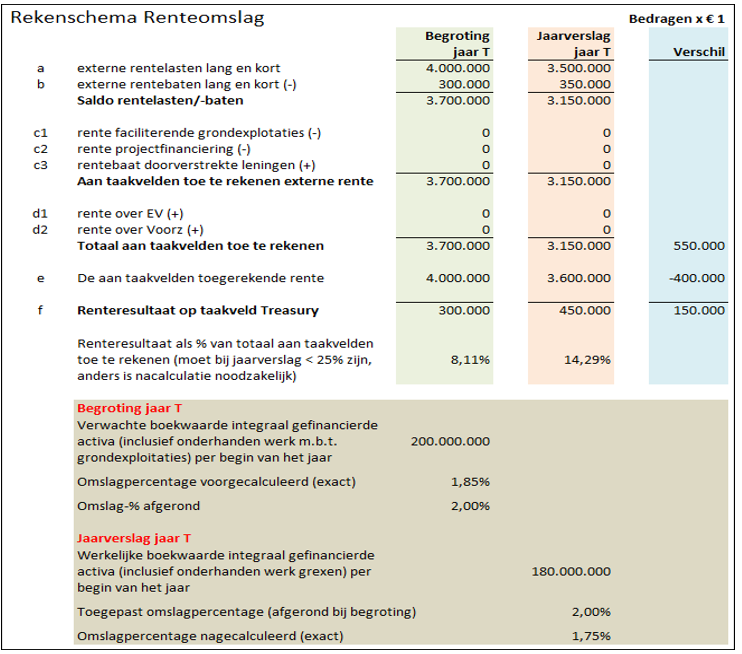 beperkingen aan de omvang van het renteresultaat. Dit resultaat wordt gedefinieerd als het verschil tussen de werkelijk aan investeringen toegerekende rente en de werkelijke totale netto rentelasten. Het renteresultaat mag niet groter zijn dan 25% van de netto rentelasten. Indien die afwijking groter is moet een nacalculatie worden toegepast. Dit betekent dat met terugwerkende kracht het omslagpercentage neerwaarts moet worden bijgesteld en de interne rentetoerekening tegen dat lagere percentage moet worden toegepast.