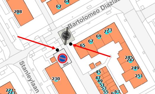 Bartolomeo Diazlaan (op de toegang tot het terrein met garageboxen ter hoogte van huisnummer 65.