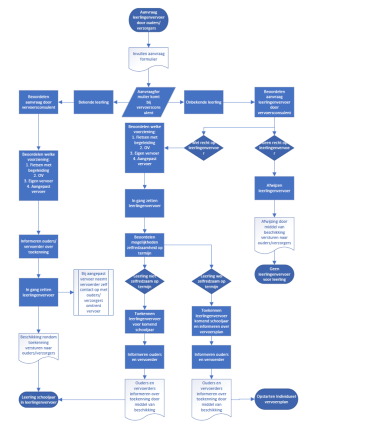 Het leerlingenvervoer kent meerdere voorzieningsmogelijkheden. In het kader van zelfredzaamheid en zelfstandigheid wordt eerst getoetst of een leerling die voldoet aan de algemene criteria zelfstandig of onder begeleiding met de fiets of een ander vervoermiddel naar school kan, als dat niet kan, wordt gekeken of de leerling met openbaar vervoer kan reizen en pas daarna kan aangepast vervoer worden ingezet.