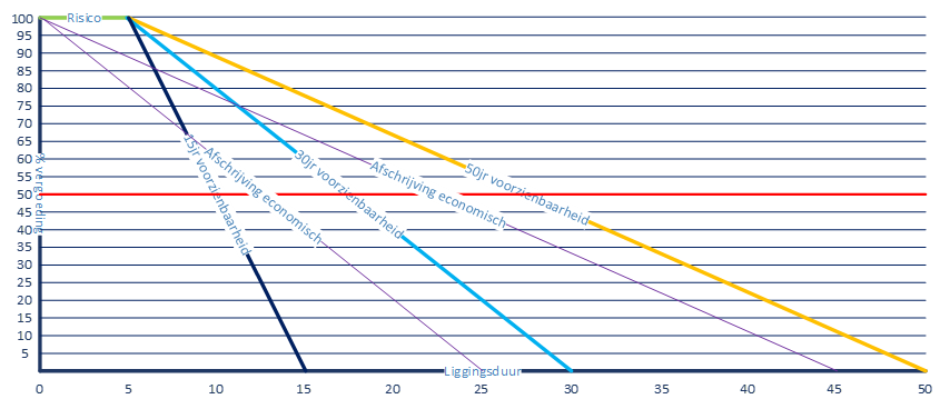 Wanneer uitgegaan wordt van een 50/50% verdeling heeft een netbeheerder al geen risico meer vanaf veertien jaar dan wel 24 jaar. Na het overschrijden van de afschrijvingslijn heeft de netbeheerder als het goed is een reconstructie-pot in zijn reserves, om zijn net mee te vernieuwen.