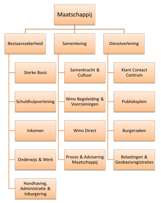 De inrichting van de afdelingen binnen het domein Maatschappij is weergegeven in de volgende organogram: