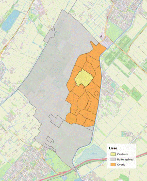 De locatie van een functie is van belang voor de omvang van de parkeervraag. Functies in het centrum hebben namelijk over het algemeen een lagere parkeervraag dan dezelfde functies aan bijvoorbeeld de rand van het dorp. Meerdere factoren zoals het autogebruik, het fietsgebruik, de OV-bereikbaarheid en de bereikbaarheid te voet, spelen hierin een rol. Als gevolg hiervan worden binnen de verschillende gebieden andere parkeernormen gehanteerd. De gebiedsindeling sluit aan bij de huidige wijkindeling van de gemeente Lisse en is weergegeven in figuur 3.1 op de volgende pagina.