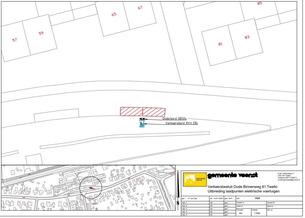 met het plaatsen van verkeersbord E8c van bijlage 1 van het Reglement verkeersregels en verkeerstekens 1990 (parkeergelegenheid alleen bestemd voor het opladen van elektrische voertuigen), voorzien van het onderbord OB504 (geldt voor twee vakken) en het aanbrengen van belijning voor twee parkeervakken nabij het adres Oude Binnenweg 81 in Twello te reserveren als parkeergelegenheid bestemd voor het opladen van elektrische voertuigen.