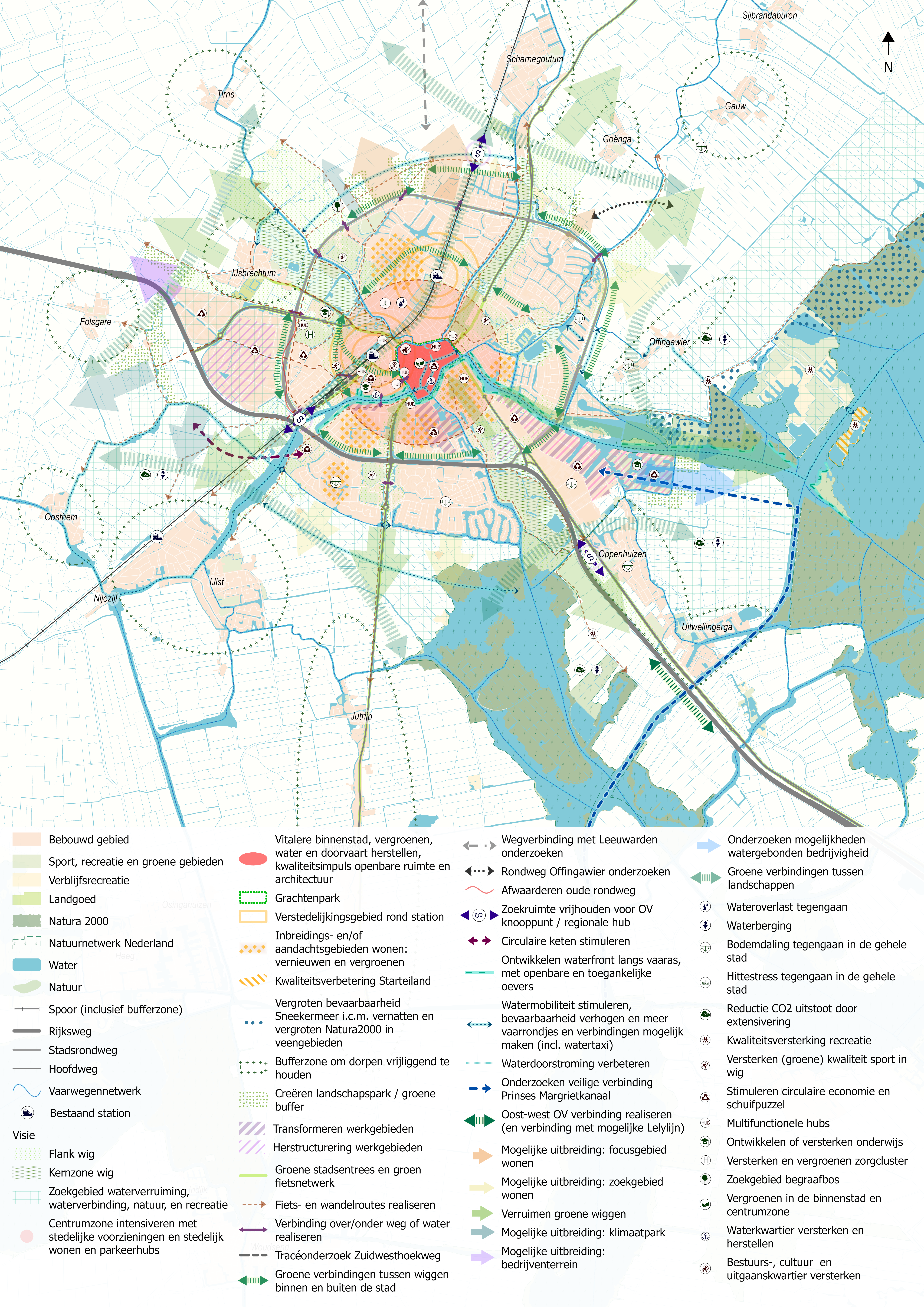 De Ruimtelijke Strategie is formeel een aanpassing van de omgevingsvisie uit 2021 en bouwt hier inhoudelijk op voort. In de omgevingsvisie wordt Sneek geschetst als een aantrekkelijke, gezonde en vitale hoofdkern van de stedelijke zone met blauwe aders en groene wiggen. In deze Ruimtelijke Strategie worden de principes uit de omgevingsvisie verbonden met de huidige grote opgaven die op Sneek afkomen, onder meer op het gebied van wonen, werken, mobiliteit en klimaat. De Ruimtelijke Strategie is een kader op hoofdlijnen. Een kader voor het uitwerken van een omgevingsprogramma voor de stad of omgevingsprogramma’s voor de verschillende sleutelgebieden (zoals Binnenstad en Spoorzone-Veemarktterrein) en voor projecten en initiatieven.