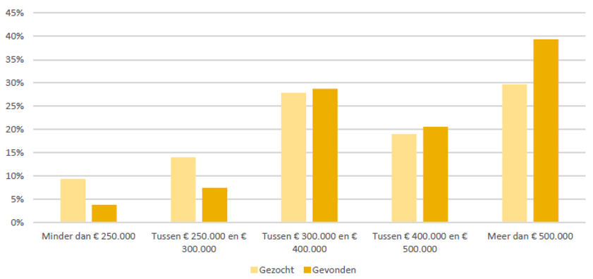 Bovenstaand overzicht laat zien dat het op basis van de nieuwbouwcijfers niet noodzakelijk is, maar dit kan een vertekend beeld geven omdat geen zicht is op de prijscategorieën. Het regionaal woningbehoefteonderzoek laat namelijk zien dat woningzoekenden concessies doen op de prijs. In algemene zin is te stellen dat des te goedkoper mensen zoeken, des te vaker ze uiteindelijk toch duurder uitkomen. Onder respondenten die verhuisd zijn naar een koopwoning heeft 30% procent een concessie gedaan op de prijs. In onderstaande afbeelding is weergegeven dat het aanbod en de vraag voor woningzoekenden in de prijscategorie van €300.000,- of hoger nagenoeg gelijk is. In de prijscategorieën daaronder is zichtbaar dat er meer gezocht wordt dan gevonden.