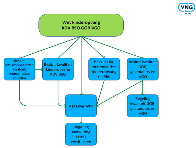 Aan kinderopvang worden kwaliteitseisen gesteld. Deze kwaliteitseisen staan in de Wet kinderopvang (Wko) en in de daarop gebaseerde algemene maatregelen van bestuur en ministeriële regelingen en aanverwante regelingen.
