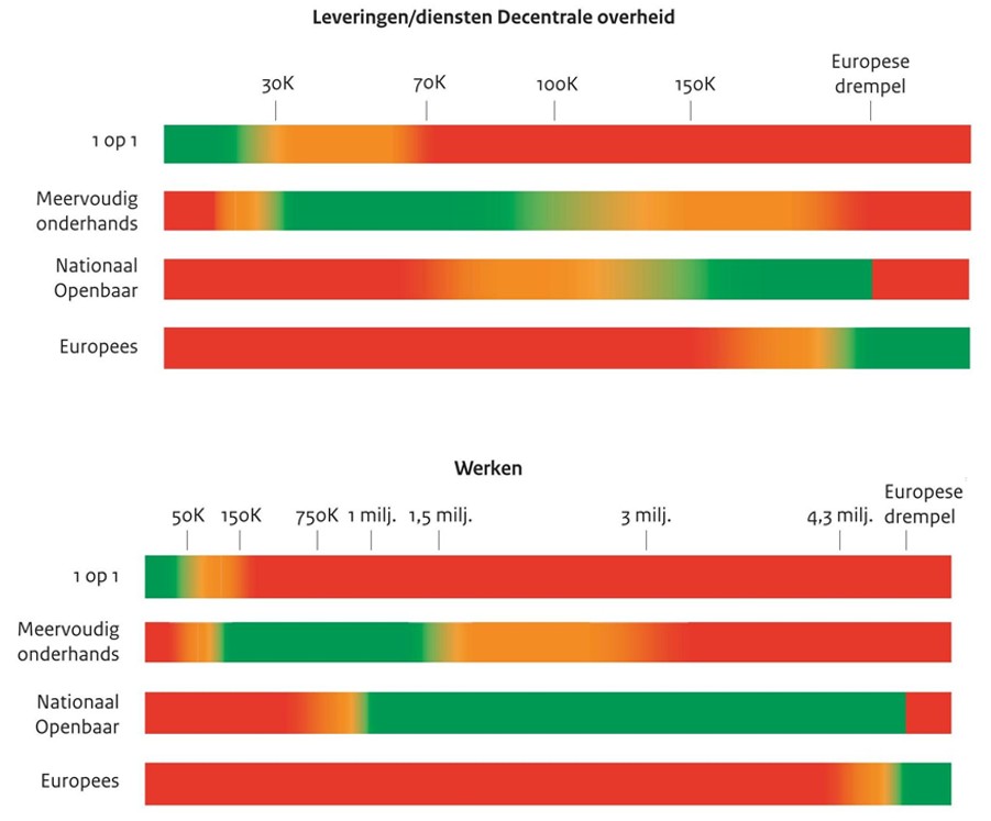 De Gemeente zal per inkoop bepalen welke inkoopprocedure zij gaat doorlopen. De te doorlopen inkoopprocedure wordt onderbouwd in inkoopstrategie. Hiervoor wordt onder andere gebruik gemaakt van voorschrift 3.4A van de Gids Proportionaliteit en onderstaande balken-schema’s, waarin de meest gangbare procedures zijn opgenomen. De Gemeente kan ook andere dan de meest gangbare procedures toepassen.
