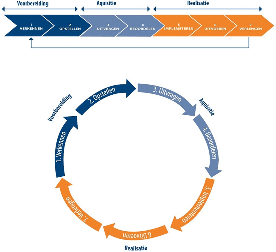 Het inkoopproces is een cyclisch proces waarbij de ervaringen vanuit eerdere inkoopprocessen input zijn voor nog te doorlopen inkoopprocessen. Het cyclische proces kent 3 hoofdfasen, met in totaal 7 stappen. In de voorbereidingsfase worden de inkoopstrategie en de inkoop-/aanbestedingsdocumenten opgesteld waarbij tevens de inbreng vanuit de contractmanage-mentfunctie wordt meegenomen. In de verwervingsfase wordt de inkoopprocedure doorlo-pen. In de verwerkelijking wordt de Opdracht uitgevoerd en vinden de contractmanagement-activiteiten plaats.