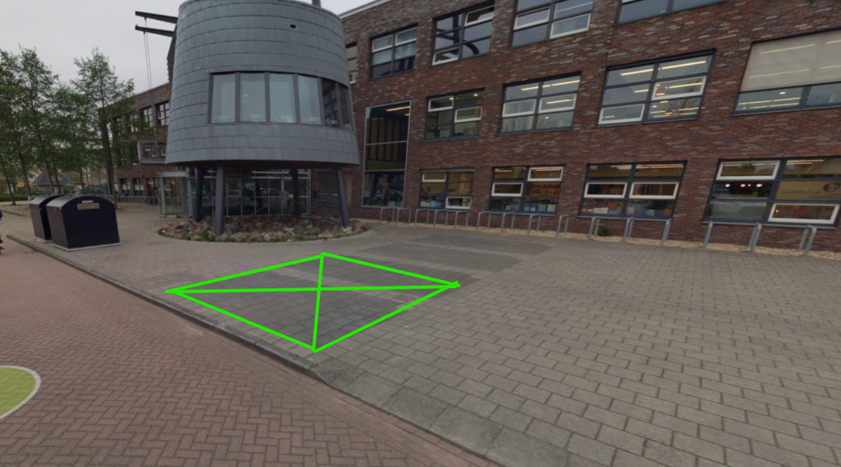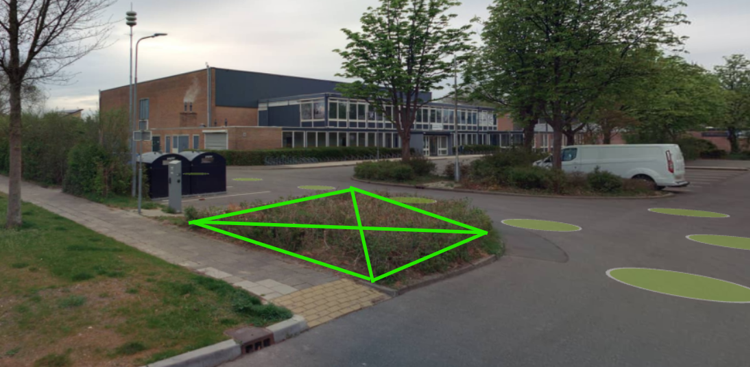 De groene blokken op de foto’s geven aan waar de containers komen te staan.