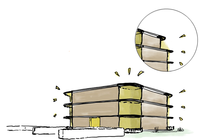 Bij de materiaalkeuze op de begane grond wordt ingezet op hergebruikte materialen of biobased materialen die de eenheid van het cluster bij elkaar houdt in soort materiaal, kleur en toepassing.