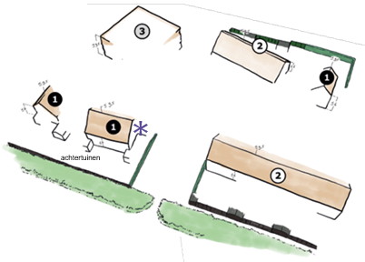 In de twee clusters van drie woningrijen is ook aandacht voor gedeelde groene ‘binnentuinen’, de hofjes. De hofjes zijn fijne plekjes voor het ontmoeten van buren, maar tegelijkertijd is er aandacht voor voldoende privacy in de eigen tuinen. Tegen de achtererfgrens zorgt een houten, zwarte schutting voor afscherming. Deze schutting maakt onderdeel uit van een totaalplan voor de gebouwde delen in de achtertuinen, zoals de berging en de afscherming van de containers. Hier dient te worden ingezet op een optimale indeling, waarbij de bergingen bij voorkeur tegelijkertijd de onderlinge scheiding tussen de privé-achtertuinen vormen.