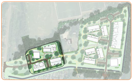 In deze hoek is ruimte voor een appartementengebouw met drie bouwlagen. De hoogte van het gebouw blijft daarmee beperkt, maar een ‘plomp blok’ moet worden voorkomen. Een natuurlijke uitstraling met hout sluit aan op de groene, beboste omgeving en zorgt voor een zacht beeld. Het gebouw wordt nog verder verzacht door afronding van de hoeken, waar zich ook buitenruimtes bevinden. De openheid van de omliggende groene ruimte komt terug in de horizontaliteit, door het aanzetten van de verdiepingsvloeren en het overstekende platte dak.