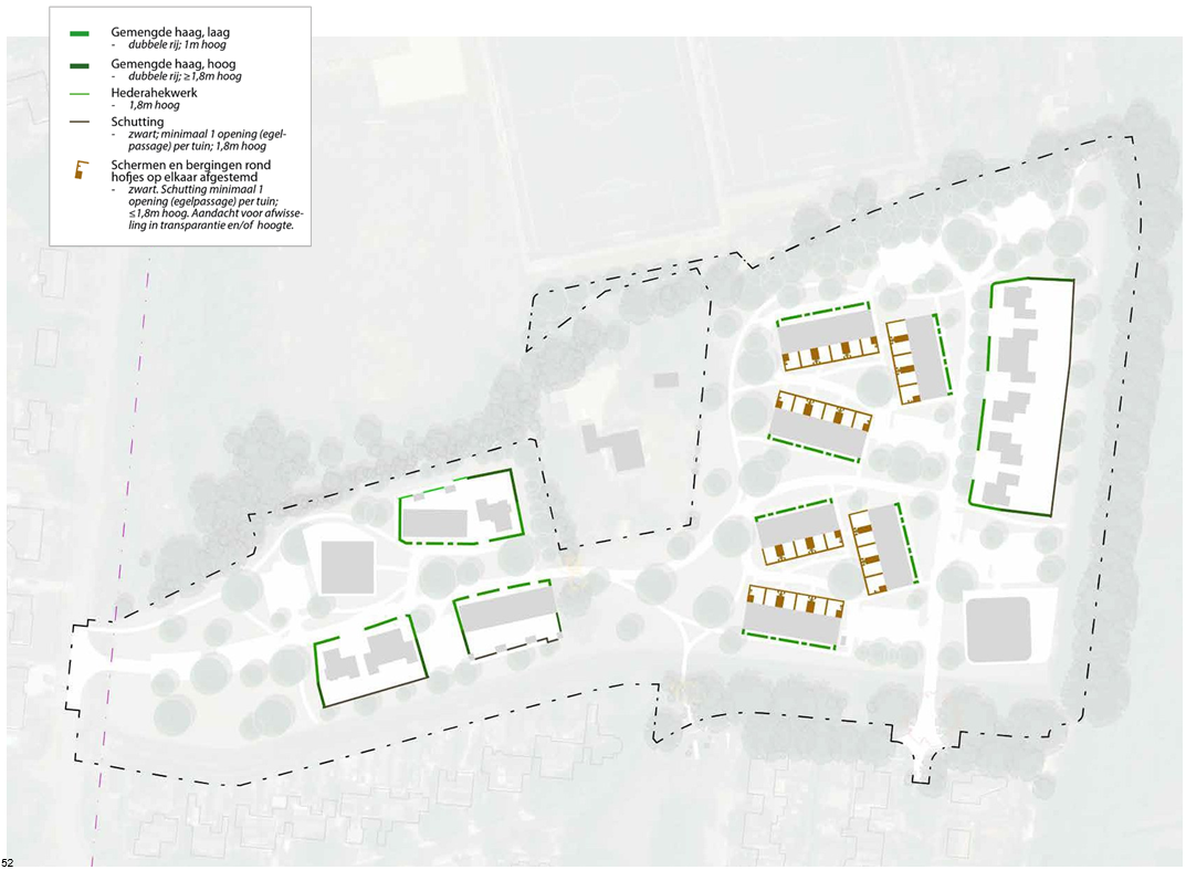 Onder meer vanwege het beheer van de openbare ruimte, zoals de groene zones langs enkele achtertuinen, is een haag of een hekwerk met klimop (hedera) niet altijd een optie. Hier worden zwarte schuttingen voorgesteld, die samen een eenduidig beeld vormen. In de hofjes is extra aandacht voor het totaalbeeld van de achtertuinen: de bergingen, containerschermen én schuttingen.