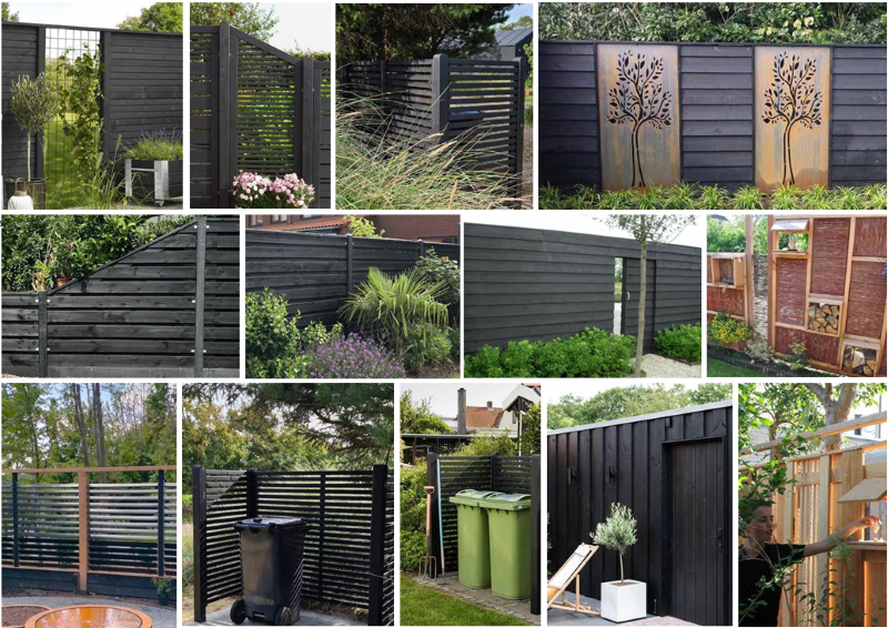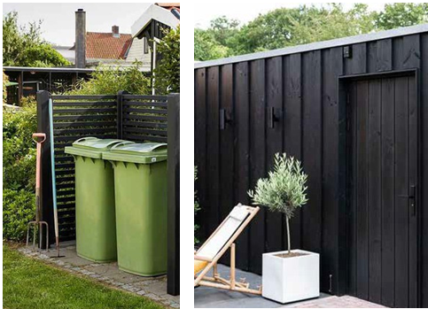 Langs enkele achtertuinen wordt direct aangrenzend beplanting in de openbare ruimte aangelegd, zoals in de hofjes. Daar is een haag of een hekwerk met klimop (hedera) geen optie, omdat die slecht te beheren zijn. Hier worden zwarte schuttingen voorgesteld, die samen een eenduidig beeld vormen. In de hofjes is extra aandacht voor het totaalbeeld van de achtertuinen: de bergingen, containerschermen én schuttingen. Natuurinclusiviteit kan hierbij een mooie inspiratie vormen. Deze pagina toont enkele voorbeelden.