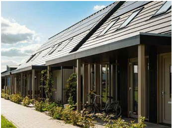 Naast dakpannen zijn hier ook andere materialen toegestaan. Vanuit duurzaamheid onderbouwd, en in kleur en uitstraling overeenkomstig met de rest van het hofje.