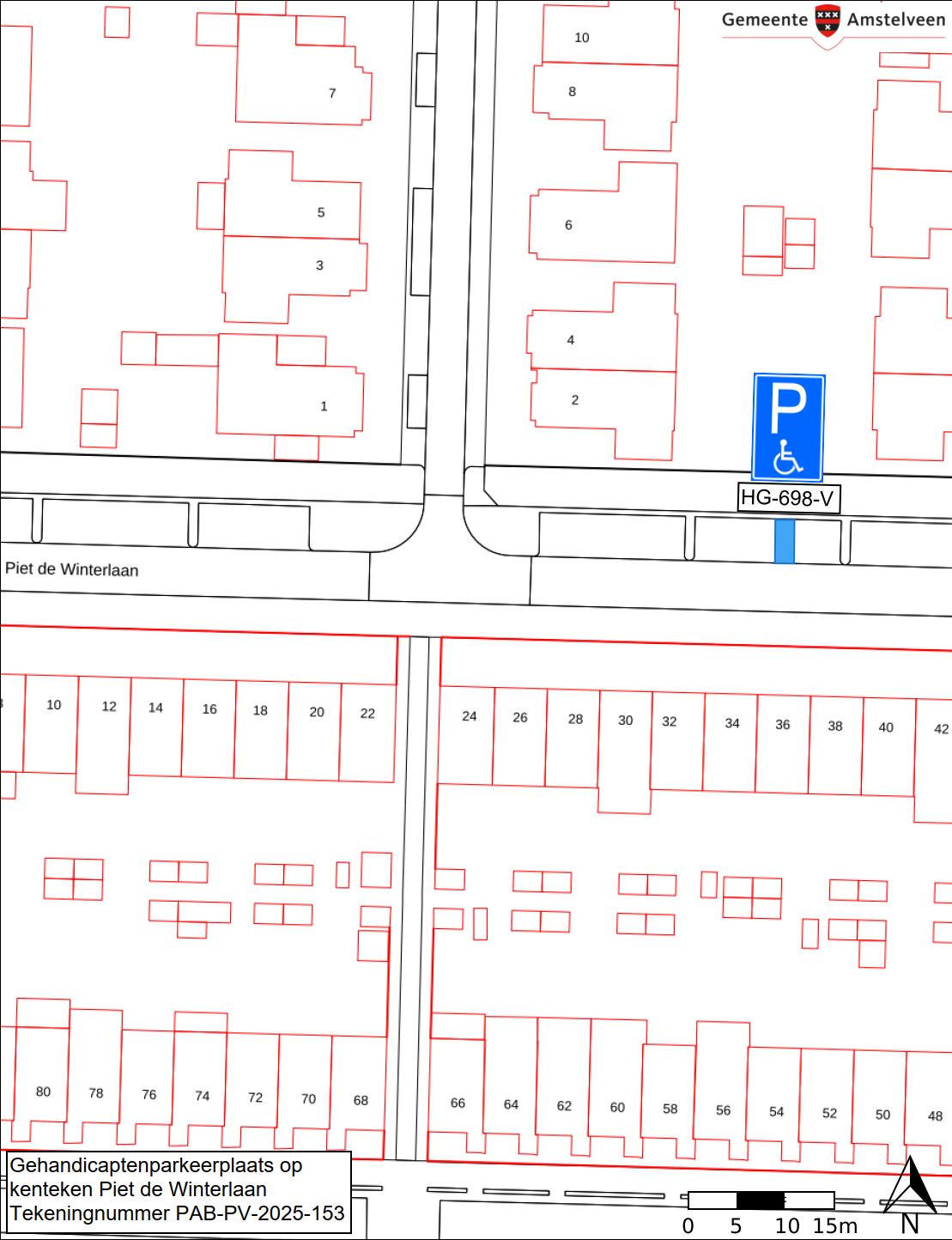 Burgemeester en wethouders van Amstelveen besluiten het parkeren te verbieden op een parkeerplaats in de Piet de Winterlaan, zoals aangegeven op tekening PAB-PV-2025-153, met uitzondering van het voertuig met het kenteken HG-698-V (gehandicaptenparkeerplaats).