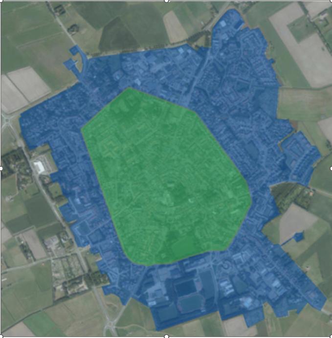 Daaronder rekenende alle reclame voerende onroerende za(a)k(en) van de dorpskern tot aan de middenbaan van de Beatrixlaan, Bernhardlaan en Emmalaan.