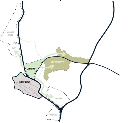 Het ruimtelijk concept bestaat uit de samenvoeging van de verschillende kwaliteiten in Overstad:
