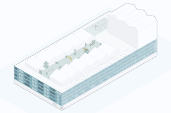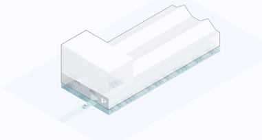 Ondergrondse parkeeroplossingen of half verdiept parkeren brengen het parkeren volledig uit het zicht. Deze oplossingen zijn kansrijk onder commerciële programma’s gecombineerd met wonen waarbij ingezet kan worden op dubbelgebruik. De entrees zijn inpandig en binnen het kavel opgelost. Deze oplossing is het meest voor de hand liggend aan weerszijden van de Koedijker- straat.
