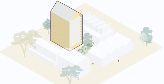 Op een aantal plekken binnen de wat diepere blokken is het mogelijk om een ‘slanke’ woontoren toe te voegen. Wonen met uitzicht leent zich bijzonder goed voor zowel starters als empty- nesters. De maximaal 11 laagse accenten staan op de tweede linie verborgen binnen de blokken waar deze