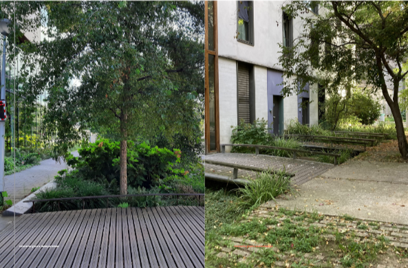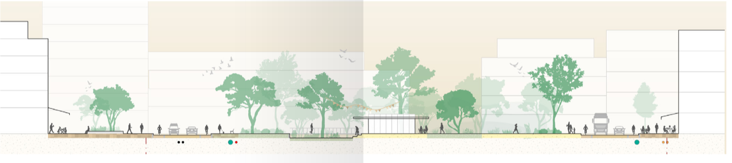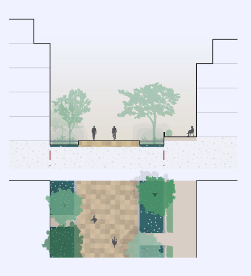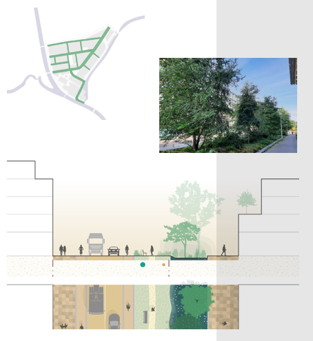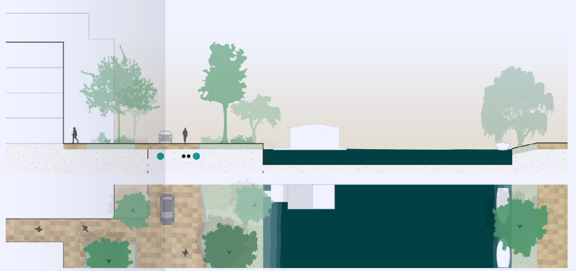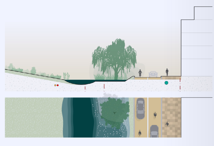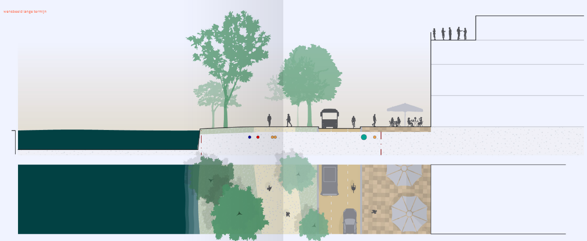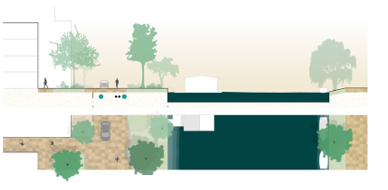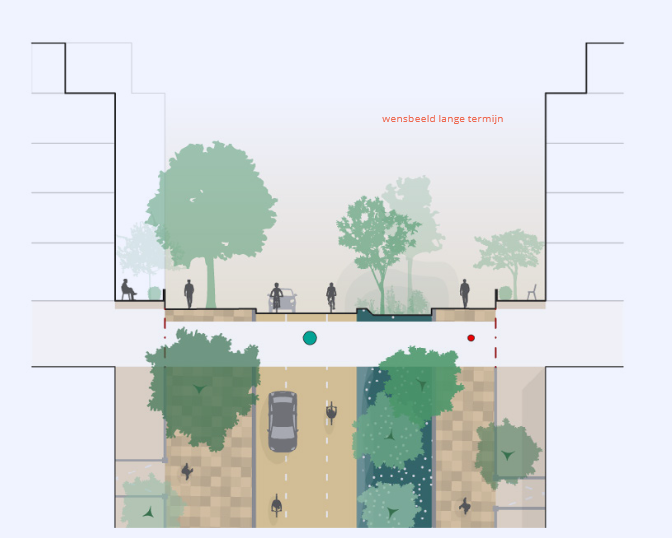 Daarnaast worden er openbare ruimtes toegevoegd voor verblijven en ontmoeten, en worden er voorzieningen aangebracht voor de verwerking van hemelwater bij piekbuien (wadi’s of infiltratie-transport systemen). Dit alles zal een beroep doen op zowel particulier als gemeentelijk eigendom.