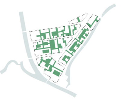 Om inzicht te verkrijgen in het laadver - mogen van Overstad is een voorbeeld- verkaveling gemaakt. Hierin zijn de programmatische ambities, zoals gefor muleerd in hoofdstuk 4, meegenomen. Deze voorbeeldverkaveling is geen ontwerp of plan, maar een manier om te testen wat de ruimtelijke kwaliteit is van het geambieerde woon, winkel, cultuur en maatschappelijk programma.