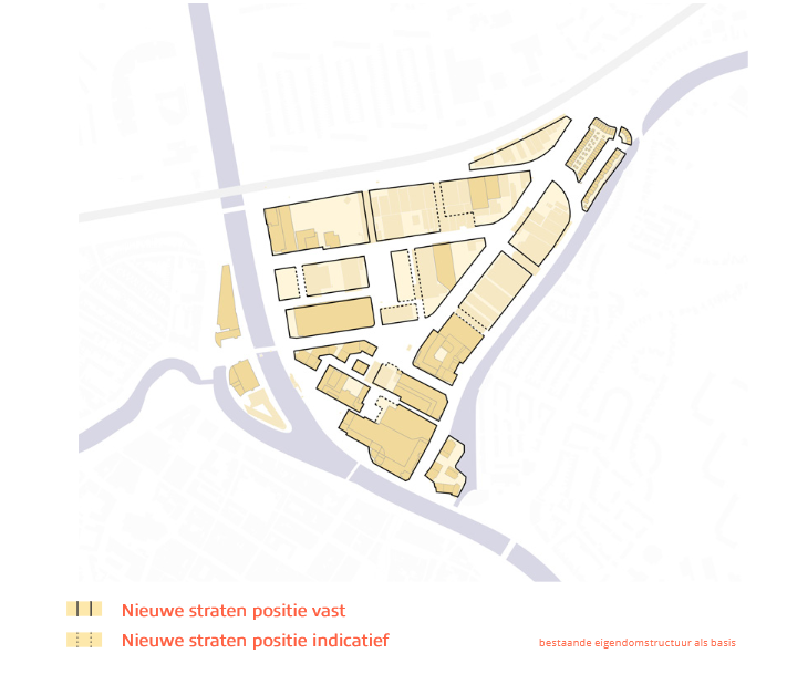 Nieuwe straten, veelal in noord-zuidrichting tussen de lange doorgaande wegen, zijn in dit Ontwikkelkader vastgelegd, zodat eigenaren bij herontwikkeling weten waar zij aan toe zijn. Zo wordt duidelijk waar de nieuwe straten moeten komen en hoeveel grond afgedragen dient te worden aan de gemeente. Deze straten worden op 2 plekken vastgelegd. De overige 5 noodzakelijke verbindingen zijn indicatief aangegeven (op de kaart gestippeld). Bij de uitwerking van