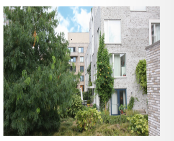 Woningen aan een collectieve tuin is een typologie passend bij het (half) gesloten bouwblok. De groene tuin kan op het maaiveldniveau liggen maar ook opgetild zijn boven winkels of parkeren. De woningen hebben een luwe zijde aan het hof en een levendige zijde aan de straat. Dit type leent zich voor alle doelgroepen. Kansrijke locaties bevinden zich in het middengebied van Overstad waar de blokken wat minder diep zijn of samen gaan met winkels.